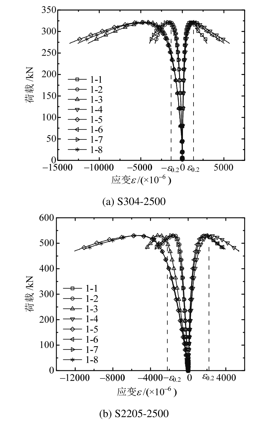 每个试件中间截面均布置8个应变片,以构件S304-2500和S2205-2500为例,在图12中列出所有8个测点的荷载-应变曲线。其中,ε0.2表示材料屈服时对应的应变,应变片1-1、1-4和1-6呈现正(受拉)应变,而应变片1-2、1-3、1-5、1-7、1-8均呈负(受压)应变,且相同截面高度处的荷载-应变曲线重合。由于偏心受压的影响,受压侧的纵向应变均大于受拉侧的应变;随着荷载的增加,拉压应变呈非线性增长,达到承载力极限状态,截面出现塑性区并且不断扩展,钢材塑性发展良好。此外,构件失稳时,柱中位置有部分截面的最大应变超过屈服应变,部分截面应变尚未达到屈服应变。