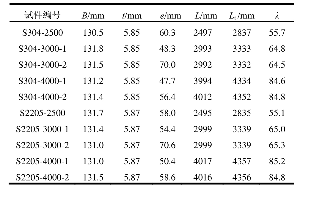试件编号B/mmt/mme/mmL/mmLt/mmλS304-2500 130.5 5.85 60.3 2497 2837 55.7 S304-3000-1 131.8 5.85 48.3 2993 3333 64.8 S304-3000-2 131.5 5.85 70.0 2992 3332 64.5 S304-4000-1 131.2 5.85 47.7 3994 4334 84.6 S304-4000-2 131.4 5.85 56.4 4012 4352 84.8 S2205-2500 131.7 5.87 58.0 2495 2835 55.1 S2205-3000-1 131.4 5.87 54.4 2999 3339 65.0 S2205-3000-2 131.0 5.87 70.6 2999 3339 65.3 S2205-4000-1 131.0 5.87 50.4 4017 4357 85.2 S2205-4000-2 131.5 5.87 58.6 4016 4356 84.8