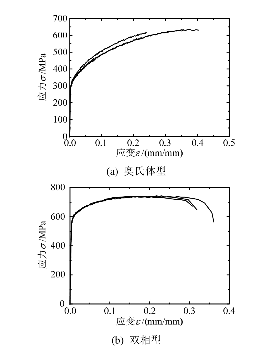 试件所采用不锈钢的材料力学性能通过拉伸试验确定,根据 GB/T 228.1—2010《金属材料 拉伸试验 第 1部分:室温试验方法》[25]中有关比例试样的规定在同一批次的不锈钢板上切取拉伸试验试样,每一批次包括3个相同的试样。拉伸试验采用 300 kN电液伺服万能试验机完成,选用标距为25 mm的引伸计测量试样的变形。拉伸试验得到的不锈钢力学性能指标如表2所示,其中,E0为初始弹性模量,f0.2为残余应变 0.2%时对应的应力值(即为不锈钢材料的名义屈服强度),fu为抗拉强度,A*为断后伸长率,根据试验曲线拟合得到应变硬化指数n。拉伸试验得到的应力-应变曲线如图4所示,其中在奥氏体型不锈钢材性试验时,由于引伸计在拉断前提前脱落,导致奥氏体型不锈钢应力-应变曲线后段缺失。