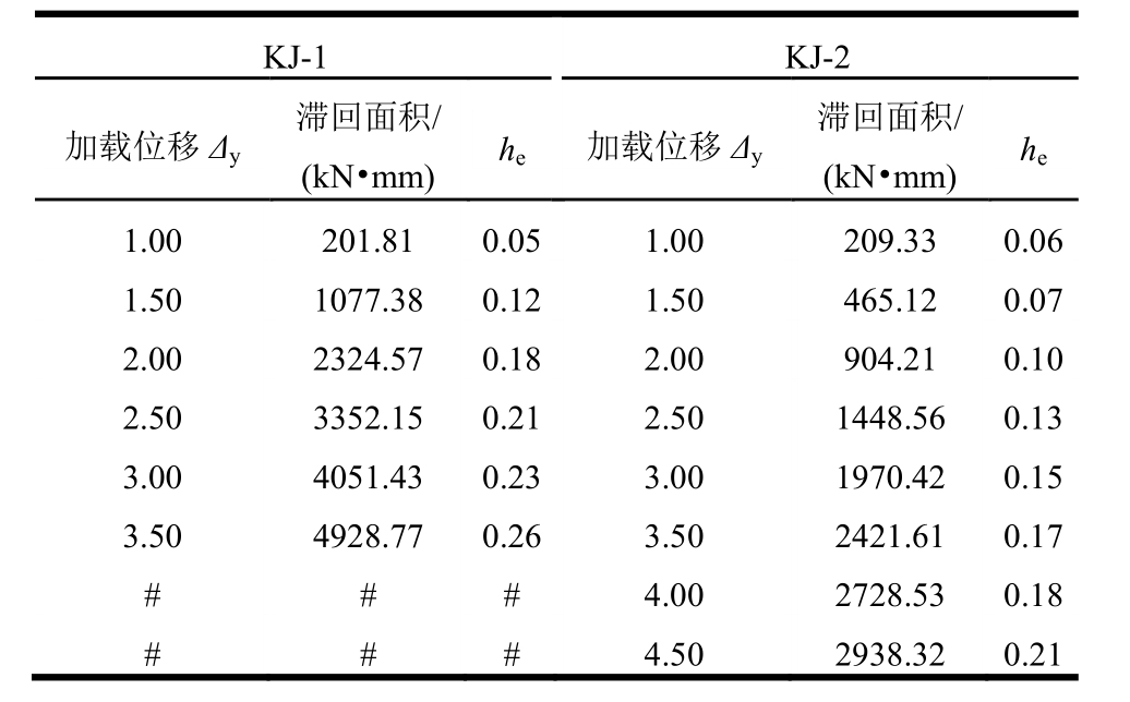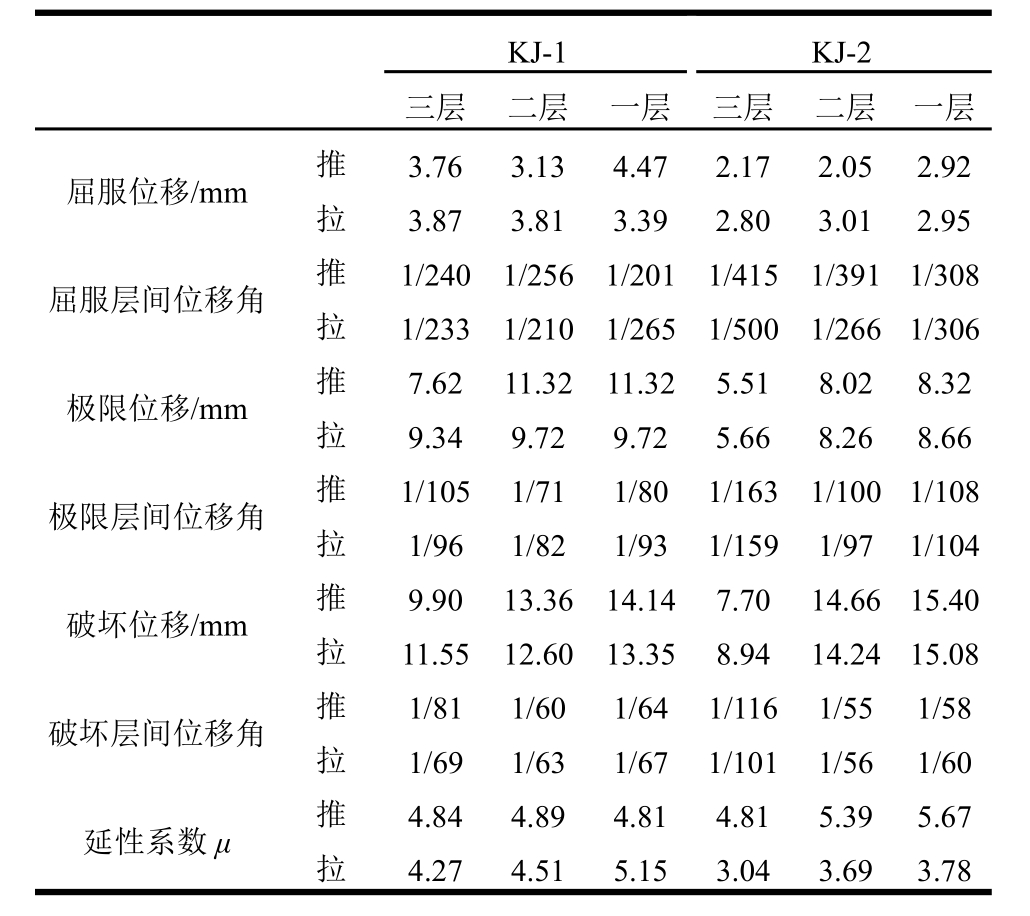 KJ-1 KJ-2三层 二层 一层 三层 二层 一层拉 3.87 3.81 3.39 2.80 3.01 2.95屈服层间位移角 推 1/240 1/256 1/201 1/415 1/391 1/308拉 1/233 1/210 1/265 1/500 1/266 1/306极限位移/mm 推 7.62 11.32 11.32 5.51 8.02 8.32拉 9.34 9.72 9.72 5.66 8.26 8.66极限层间位移角 推 1/105 1/71 1/80 1/163 1/100 1/108拉 1/96 1/82 1/93 1/159 1/97 1/104破坏位移/mm 推 9.90 13.36 14.14 7.70 14.66 15.40拉 11.55 12.60 13.35 8.94 14.24 15.08破坏层间位移角 推 1/81 1/60 1/64 1/116 1/55 1/58拉 1/69 1/63 1/67 1/101 1/56 1/60延性系数μ推 4.84 4.89 4.81 4.81 5.39 5.67拉 4.27 4.51 5.15 3.04 3.69 3.78屈服位移/mm 推 3.76 3.13 4.47 2.17 2.05 2.92