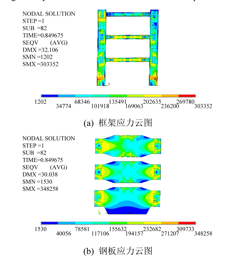 Fig.12 Stress nephogram of frame filled with steel plate walls
