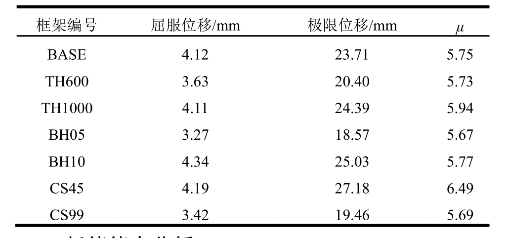 框架编号 屈服位移/mm 极限位移/mmμBASE 4.12 23.71 5.75 TH600 3.63 20.40 5.73 TH1000 4.11 24.39 5.94 BH05 3.27 18.57 5.67 BH10 4.34 25.03 5.77 CS45 4.19 27.18 6.49 CS99 3.42 19.46 5.69