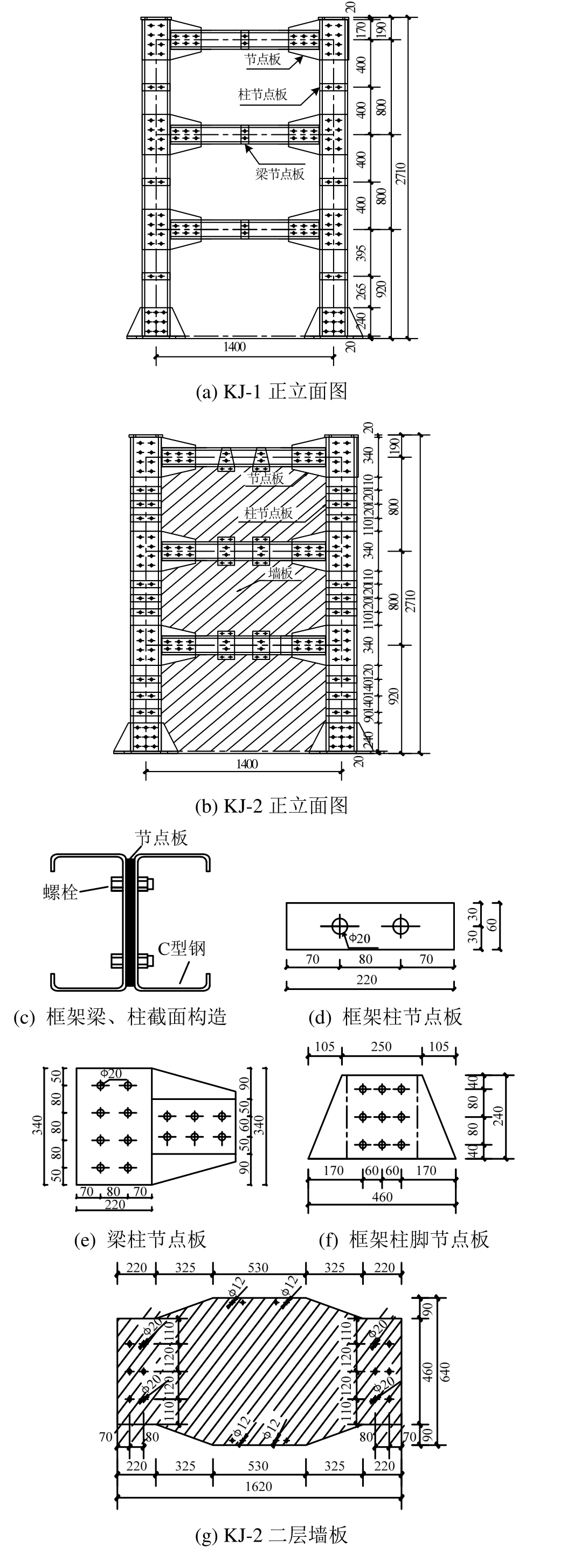 2榀三层单跨双肢C型钢框架(KJ-1和KJ-2)柱、梁分别采用双肢 C220 mm×50 mm×20 mm×2.5 mm和双肢C140 mm×50 mm×20 mm×2.5 mm截面,中间节点板为8 mm厚热轧钢板,KJ-1为空框架,KJ-2为钢板墙框架,钢板墙采用非加肋薄钢板,全长、全高布置。试验框架按 1∶4的缩尺比例设计,如图1所示。