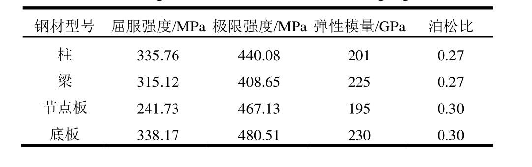 钢材型号 屈服强度/MPa 极限强度/MPa 弹性模量/GPa 泊松比柱 335.76 440.08 201 0.27梁 315.12 408.65 225 0.27节点板 241.73 467.13 195 0.30底板 338.17 480.51 230 0.30
