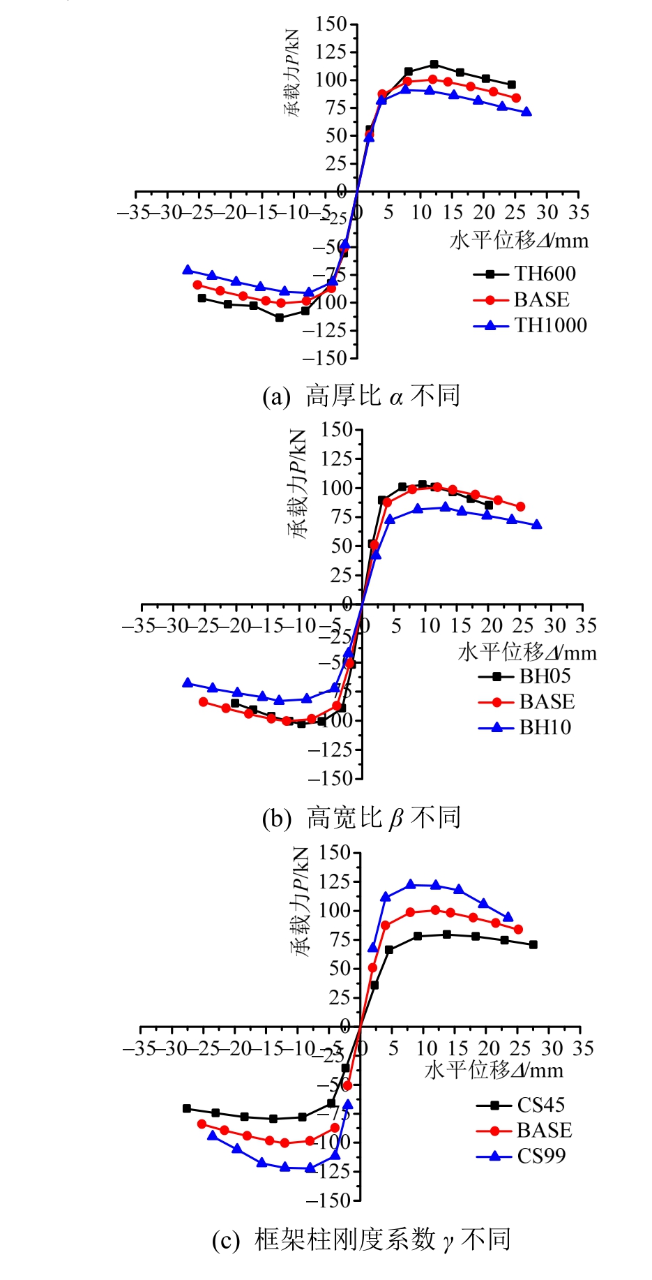 钢板墙高厚比α、高宽比β和框架柱的刚度系数γ不同时骨架曲线对比如图14所示。