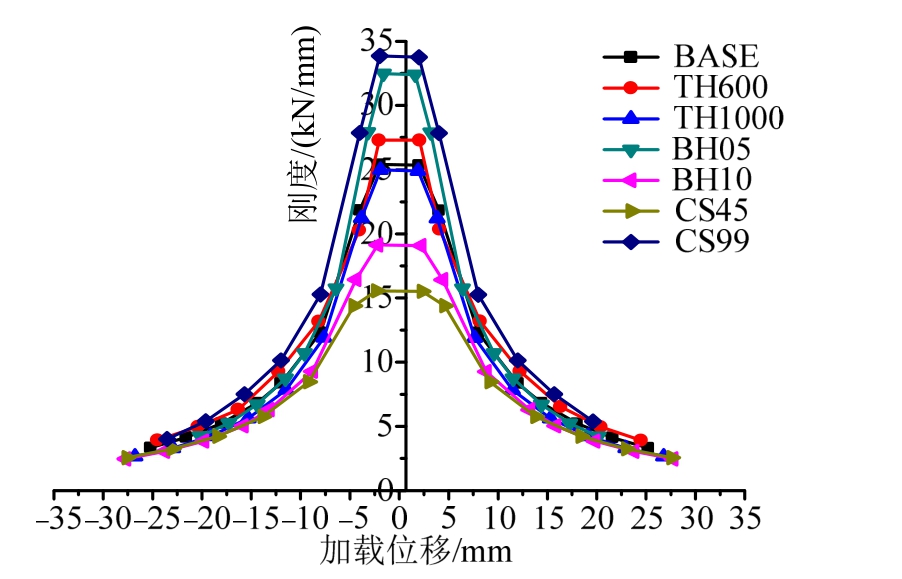7榀有限元模拟框架的刚度退化如图15所示。有限元模拟刚度退化曲线的变化趋势相似,开始加载时,各榀框架初始刚度大,刚度退化明显。框架屈服后,钢板墙逐步参与受力充分发挥作用,刚度退化较屈服前明显变缓。框架破坏以后,刚度退化趋于稳定。TH600各个阶段的退化刚度大于TH1000,BH05各个阶段的退化刚度大于 BH10,CS99各个阶段的退化刚度大于CS45。数据分析得知,钢板墙高厚比、高宽比、框架柱的刚度系数等因素对这7榀框架的刚度退化影响较大。