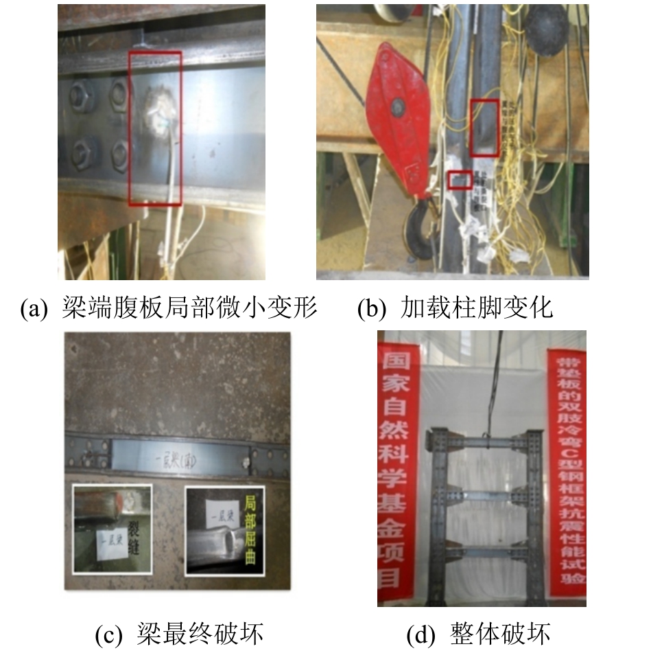 KJ-2加载初期也没有明显的试验现象,只是在推拉转换的过程中伴有轻微的声响。之后框架左右柱脚微弱张开,各层钢板墙梁柱连接端附近出现微小的局部变形如图4(a)。随着荷载的增加,一层右侧梁端前后肢C型钢腹板张开,一层、二层梁与柱螺栓连接线上形成多条拉力带。最后,一层钢板墙出现一条宽而通长的连接左右柱的拉力带如图4(b)。二层钢板墙与梁、柱螺栓连接处屈曲变形严重,钢板上呈现两条拉力带。框架左右柱脚出现明显屈曲变形如图4(c),腹板局部屈曲严重。钢板墙框架破坏过程钢板墙形成了拉力带,有效地耗散能量。整体破坏如图4(d)所示。