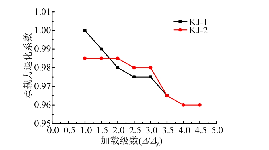 承载力退化曲线如图7所示。2榀框架承载力退化稳定,退化系数均大于0.95,加载后期柱脚发生破坏承载力退化明显,内填钢板墙并未影响框架的持荷能力。