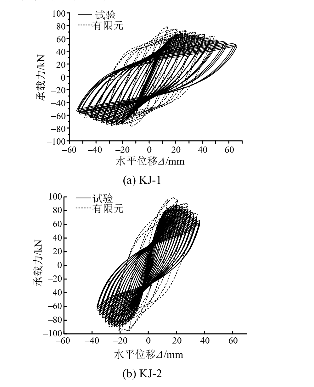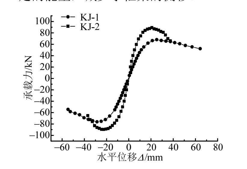 2榀框架在加载过程承载力水平位移骨架曲线如图6所示。2榀框架均呈现出良好的承载能力和延性,KJ-2的内填钢板既提高了框架的承载力,消耗了一定的能量,减少了框架的侧移。
