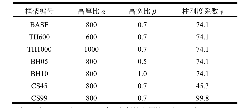 框架编号 高厚比α高宽比β柱刚度系数γBASE 800 0.7 74.1 TH600 600 0.7 74.1 TH1000 1000 0.7 74.1 BH05 800 0.5 74.1 BH10 800 1.0 74.1 CS45 800 0.7 45.3 CS99 800 0.7 99.8