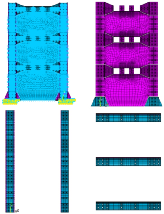 从钢板墙框架滞回曲线(图 11)和应力云图(图12)可以看出:有限元分析的破坏形态及过程与试验相同,梁端先于柱脚屈服,钢板墙应力集中出现在墙板与框架梁、柱连接部位。分析数值结果整体上承载力偏高,位移偏小,滞回环偏饱满,这是由于有限元模型忽略了框架的初始变形,同时施加了平面外约束造成的。承载力的偏差在误差允许范围内,而位移值偏差较大,主要是因为有限元模拟采用BEAM188和COMBIN39单元无法精准实现框架螺栓的滑动,尤其是加载后期的螺栓滑移,而采用实体 SOLID单元会耗费较大的计算资源,考虑摩擦型高强螺栓在设计上是不允许螺栓滑移的,因此在分析时采用了BEAM单元进行模拟,能较为准确地反映框架受力过程。