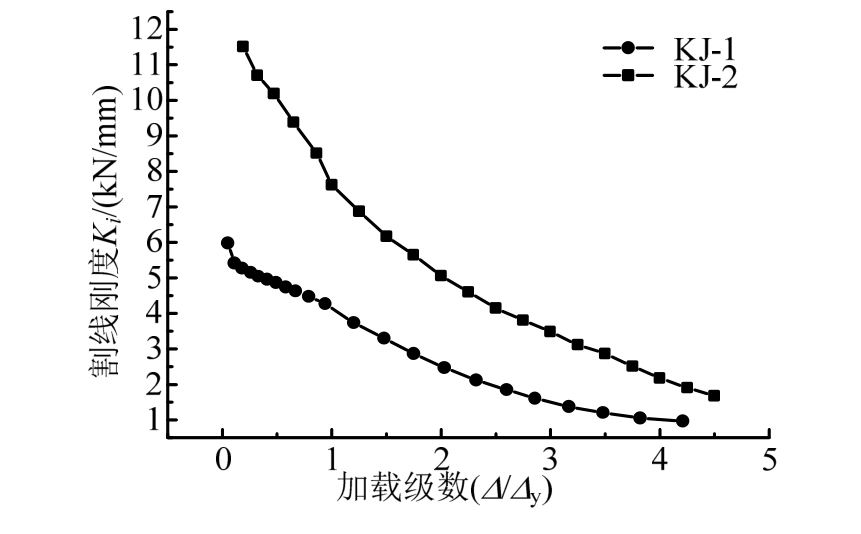 框架刚度及其退化情况如图8所示。KJ-2在整个加载过程中刚度始终大于KJ-1,说明内填钢板可以有效的提高框架的刚度。KJ-1刚度退化平缓,在屈服之前刚度下降约25%,屈服后刚度下降约75%,说明双肢C型钢框架在屈服之前框架整体性能好,当发生屈服后框架的整体性降低,刚度退化明显。KJ-2在屈服之前,由于钢板不能完全参与受力,导致初始阶段刚度下降约75%,框架屈服后,钢板参与受力发挥作用,刚度退化变缓。