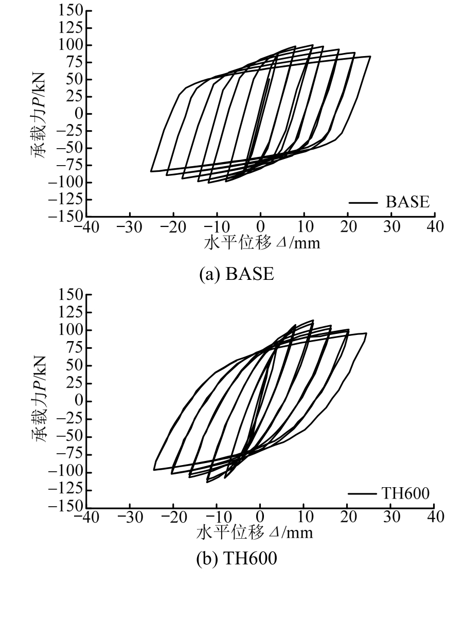 图 13所示为各参数框架滞回曲线,滞回环形状饱满,类似于梭形,说明内填钢板墙框架的抗震性能好。开始加载时框架处于弹性阶段,滞回曲线基本呈现出一条过原点的直线。进入弹塑性工作阶段时,钢板墙部分区域发生屈曲,框架刚度开始出现下降趋势,滞回环所包络的面积逐步增大。进入破坏阶段后,钢板墙依靠所形成的拉力带支撑框架,受力简图类似于柔性支撑框架,滞回曲线饱满。