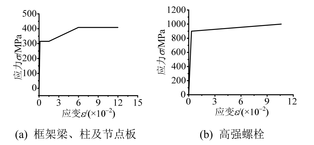 有限元模型建立采用 ANSYS前处理器中PRPE7程序,在模型建立的过程中,梁、柱、节点板、钢板墙均采用四节点的有限应变壳SHELL181单元[19];用弹簧单元 COMBIN39将螺栓杆与节点板和C型钢的螺栓孔相连接,模拟摩擦型高强螺栓的剪切和扭转的效果,并以PSMESH命令生成预紧力单元作用于螺栓孔;高强摩擦型螺栓采用3D线性有限应变梁BEAM188单元,具有扭转变形效果。框架柱、梁和节点板本构关系简化为多线性随动强化刚度(MKIN),高强螺栓简化为双线性随动强化刚度(BKIN),应力-应变曲线如图9所示。