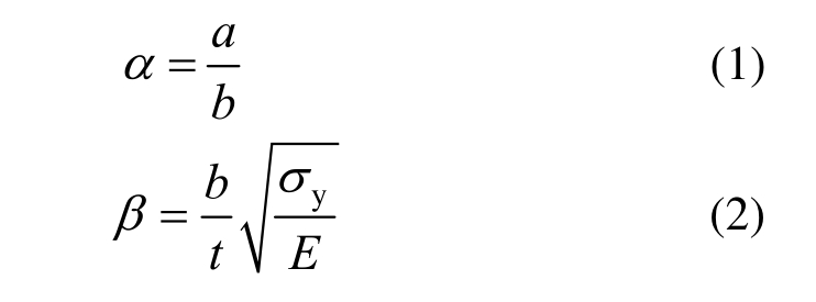 无加筋板计算模型的主要结构参数和材料性能均取自 ISSC 2012会议报告[28]。基准板的板长a=2550 mm,板宽b=850 mm,板厚t=16 mm。Zhang[29]通过研究船体长度在150 m~400 m的油船和散货船的结构板尺寸,发现结构板的长宽比(α)大约为3.5~6.7,而板宽b大约在0.7 m~1.0 m。因此,为提高本文研究的适用性,在确定计算模型的主要结构尺寸时,均参考上述常规结构板的尺寸范围,详细的结构尺寸如表1所示。两个重要的结构参数,长宽比α和长细比β的定义见式(1)和式(2)。材料屈服强度σy=313.6 MPa,弹性模量E=205.8 GPa,泊松比为ν=0.3,其材料本构为理想弹塑性模型。模型的边界条件取为四边简支,荷载为沿板长度方向单轴向压缩,取弹性屈曲一阶失稳模态作为结构的初始缺陷模式,其幅值为0.1β2t。