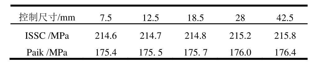 控制尺寸/mm 7.5 12.5 18.5 28 42.5 ISSC /MPa 214.6 214.7 214.8 215.2 215.8 Paik /MPa 175.4 175. 5 175. 7 176.0 176.4