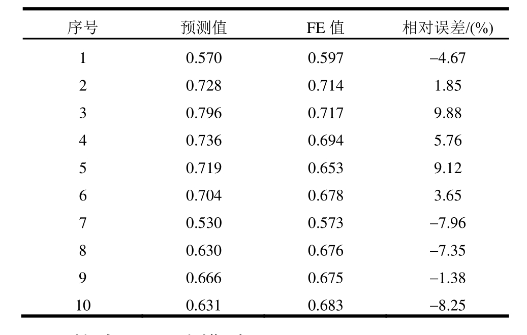 序号 预测值 FE值 相对误差/(%)1 0.570 0.597 -4.67 2 0.728 0.714 1.85 3 0.796 0.717 9.88 4 0.736 0.694 5.76 5 0.719 0.653 9.12 6 0.704 0.678 3.65 7 0.530 0.573 -7.96 8 0.630 0.676 -7.35 9 0.666 0.675 -1.38 10 0.631 0.683 -8.25