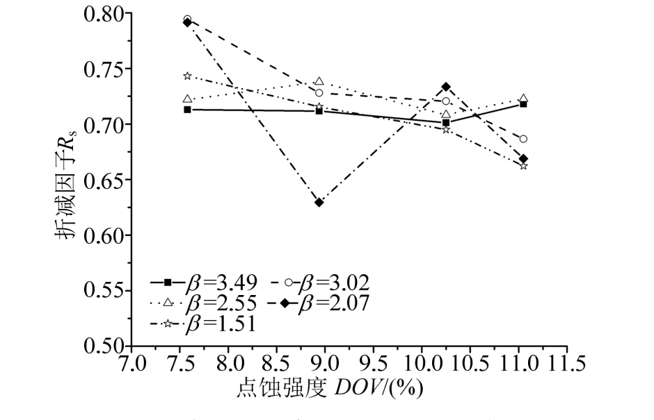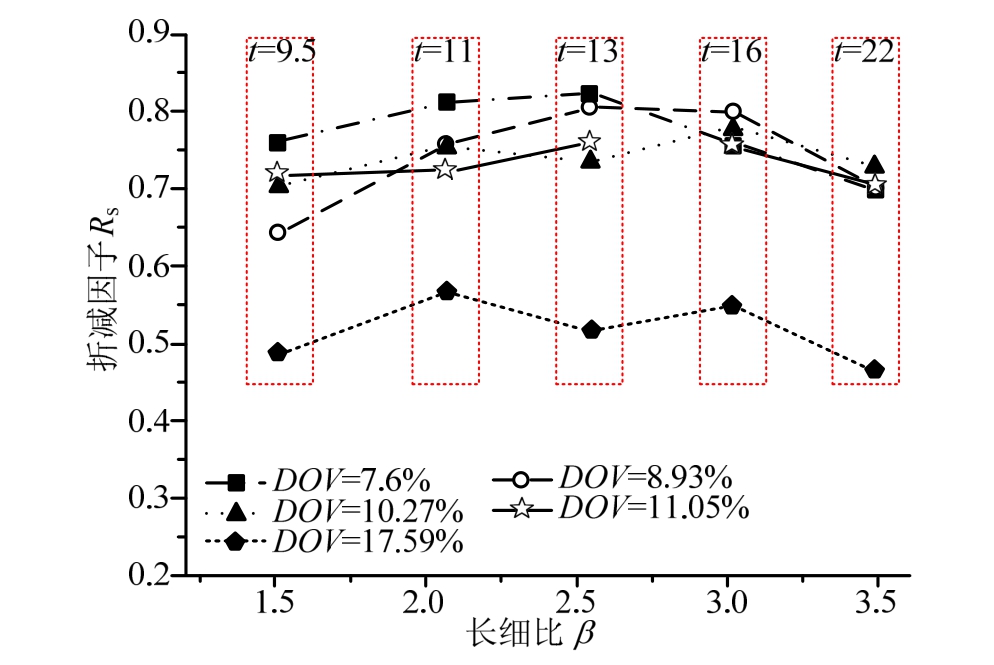 图3的结果表明,当腐蚀体积比DOV大约为10%时(7.6%、8.93%、10.27%和 11.05%),长细比与强度折减因子Rs之间的关系,呈现出极值函数的特征。例如,当长细比为β=2.55时(t=13 mm),在各种腐蚀状态下,该板的强度退化要比其他壁厚的板小得多(剩余强度最大),但随着长细比变化(板厚加大或减薄),板的强度退化均变得越来越严重。此外,当β<2.55时,随机点蚀损伤板的极限强度,随腐蚀程度的加大退化极为明显;但当β>2.55时,在各种腐蚀状态下,板的强度退化趋于一致。这意味着当长细比超过2.55后,大长细比的板对腐蚀强度的变化不敏感,且长细比决定了板的极限强度。