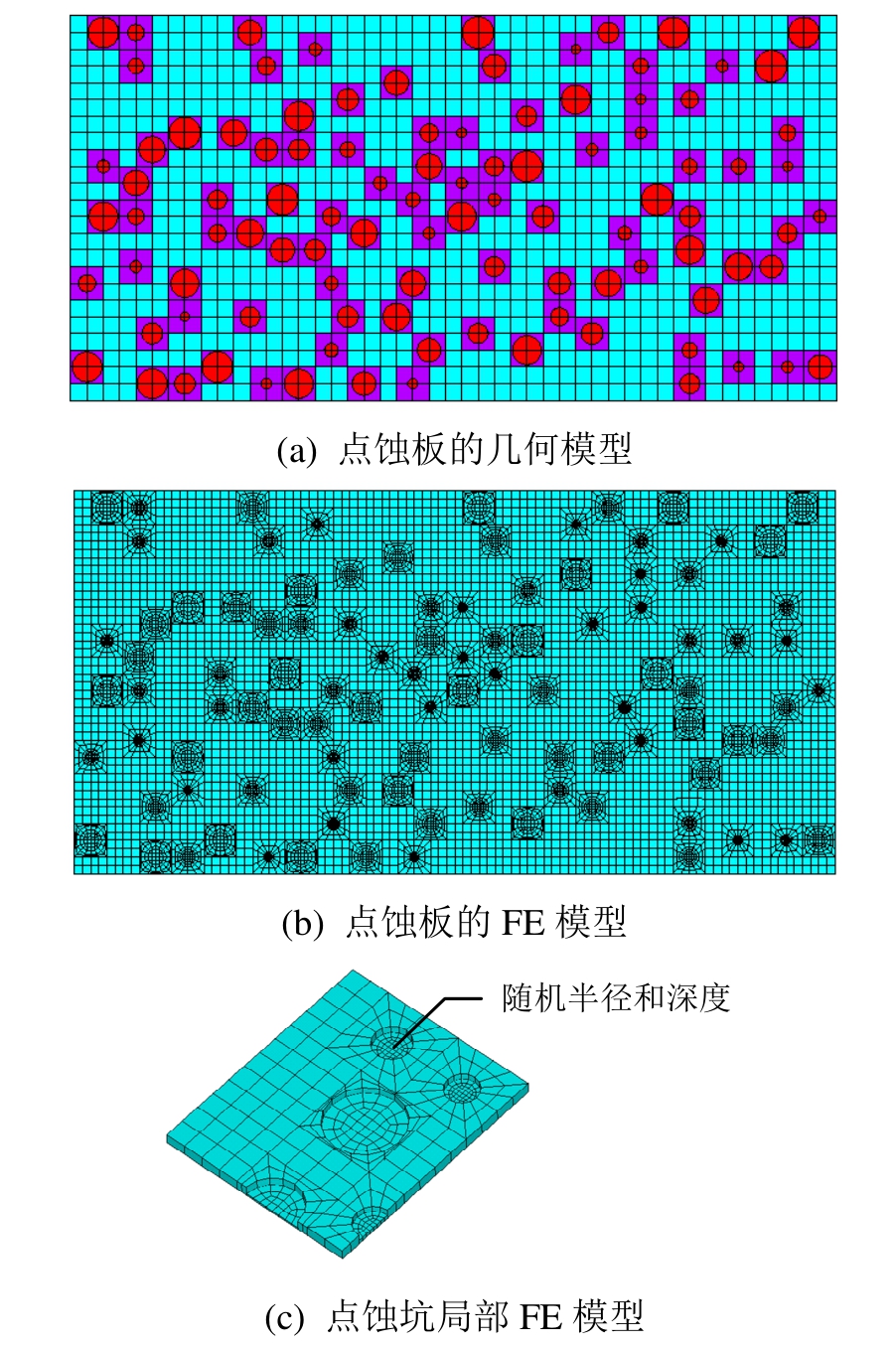 点蚀的分布形式、蚀坑尺寸和深度均有复杂的随机性,蚀坑深度被认为是描述点蚀演化的主要指标[33-36]。事实上,在构建点蚀结构的FE模型时,如何合理地反映蚀坑深度的随机性,是能否正确理解点蚀结构力学行为的关键[3]。本文引入随机模拟方法,利用三个随机参数描述点蚀的分布形式、蚀坑形状和深度,生成随机态的点蚀形貌,及其精细的四边形有限元网格模型[37-38]。在所模拟的随机点蚀中,点坑直径在20 mm~70 mm变化,服从均匀分布,均值为 21.68 mm,标准差为 7.54 mm。IACS[6,39]规范规定:当腐蚀面积比超过15%时要开展腐蚀测量,且强框架构件的剩余壁厚不小于75%的原始厚度;舷侧板的剩余厚度不小于70%的原始厚度。因此,本文模拟的随机点坑深度在0~t(板厚)变化,均值为0.5tmm,标准差为0.24tmm,如图1所示为一个代表性的点蚀板有限元模型。