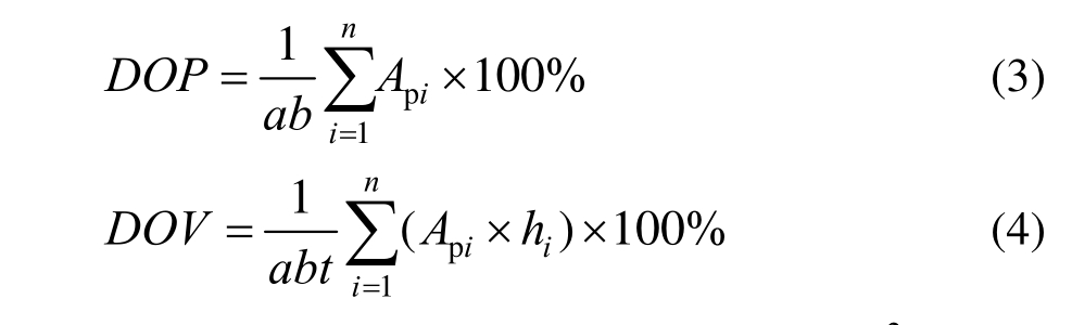 根据每一个随机点坑的蚀坑半径和深度,考虑所有的点坑影响,可依据式(3)和式(4)计算出结构的腐蚀强度和DOP腐蚀体积比DOV。