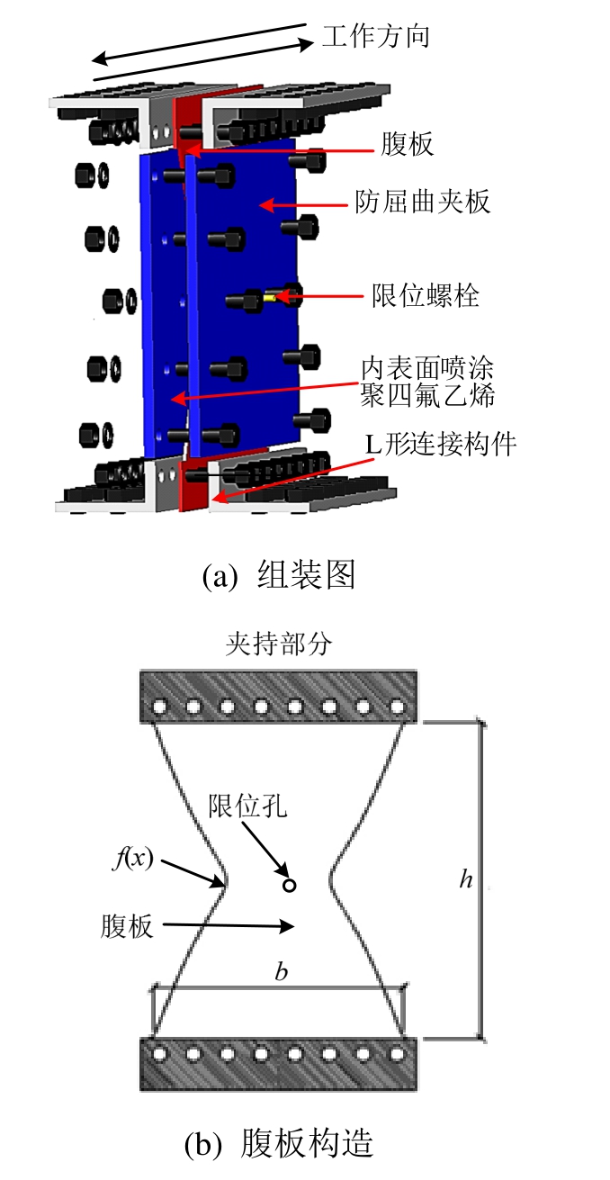 为了避免焊接热效应对阻尼器力学性能的影响,实现阻尼器在大震后可快速更换的能力,本文采用全螺栓装配构造设计了一种新型形状优化剪切型金属阻尼器。这种阻尼器的主要元件包括腹板(耗能元件)、L形连接构件以及防屈曲夹板,其构造如图1所示。L形连接构件与腹板通过高强螺栓装配在一起,连接构件和腹板的接触面需做防滑处理。由于腹板宽厚比较大,易发生面外屈曲,在腹板外侧设置防屈曲夹板。防屈曲夹板与腹板接触表面需喷涂聚四氟乙烯材料,减小各个板件之间的摩擦。为了防止防屈曲夹板在工作时的滑动,在腹板中央设置限位孔,用限位螺栓限制防屈曲夹板的自由滑动。在阻尼器工作时,除腹板以外的构件均保持弹性,变形集中在腹板上。阻尼器腹板的曲线边缘采用线切割工艺,电极丝的直径小于0.3 mm,切割过程中需做好冷却,并保持切割速度在0.1 mm/s以内,控制钢板局部热加工所造成的残余应力。