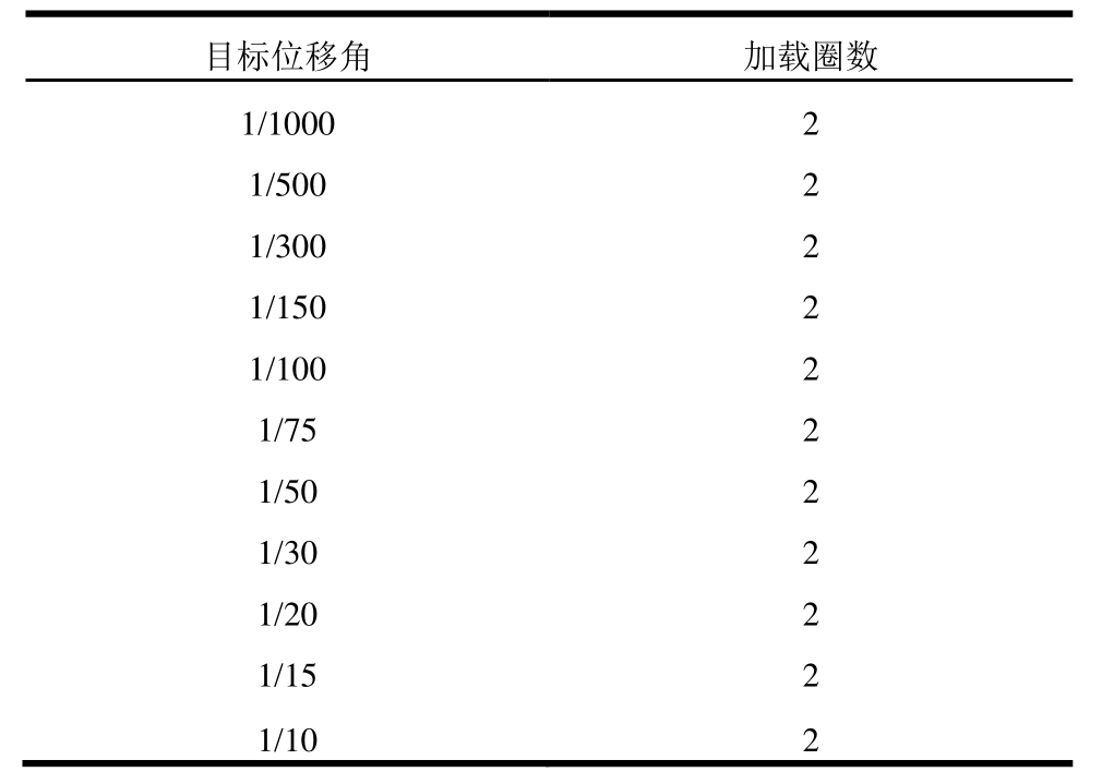 采用如图2所示的加载装置进行拟静力试验加载。加载梁与上部的四连杆机构相连,四连杆机构可有效限制加载梁的转动,使其仅发生水平与竖直平动,且竖直与水平的运动互不干扰,因此可有效模拟阻尼器在连梁中的真实边界条件。阻尼器通过转换钢梁分别与加载梁和地梁连接。竖向千斤顶采用力控制加载,用于平衡加载梁、四连杆机构和水平作动器的自重,以及施加可控轴力;加载梁通过水平的作动器与反力墙相连,水平的作动器采用位移控制,加载制度如表2所示。当阻尼器的承载力下降到极限承载力的85%时[10],认为构件失效,停止加载。设置2个水平位移计分别测量腹板上下被夹持部位的水平位移,其差值用于水平作动器的目标位移控制。