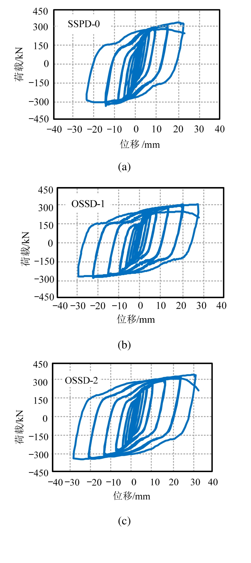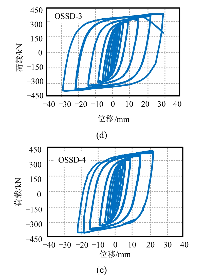 图3为5个阻尼器的滞回曲线。从图中可以看出SSPD-0、OSSD-1与OSSD-2均在0.5倍极限承载力附近发生捏拢现象,随后承载力继续上升,而OSSD-3与OSSD-4未发生明显捏拢现象,分析原因是特别加固了面外约束板,减少了面外屈曲,使得滞回曲线更加饱满。SSPD-0与OSSD-1具有相同的高宽尺寸,前者极限位移角为1/20,后者极限位移角为1/15,可见优化后的阻尼器延性更好。为了避免阻尼器在较大轴力下的面外屈曲,实际施加轴力分别为25 kN、50 kN和75 kN。OSSD-4的极限位移较其他优化型阻尼器小,说明轴力过大将对阻尼器的延性产生不利影响。