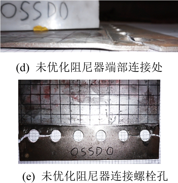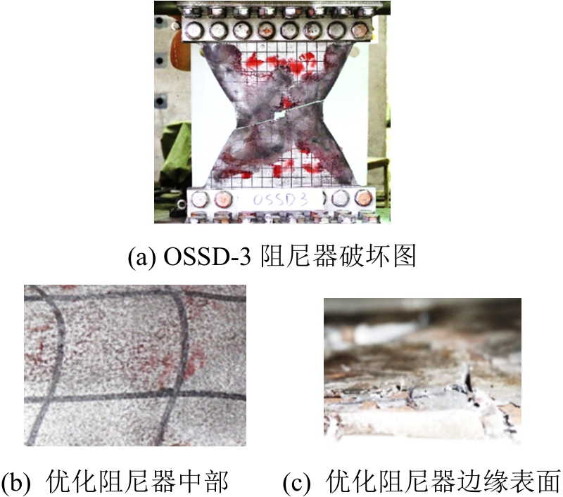 为了便于更加详细观察腹板的局部变形,本文在加工腹板时,将腹板表面雕刻了 0.1 mm深度的网格线,并用黑色记号笔涂色,如图4所示。从图中可以看出,对于未优化的阻尼器来说,其破坏表现为腹板连接夹持部位的螺栓孔被撕裂,如图4(e)所示,螺栓滑移痕迹明显;端部连接处有局部屈曲现象,如图4(d)所示,端部的标记线弯曲,但腹板中部标记线未有明显变化,说明未优化的阻尼器耗能集中在端部连接部分,在阻尼器未充分进入耗能状态时已经提前退出工作。而优化型阻尼器的破坏特征均为腹板中部的剪切斜裂缝,其典型模式如图4(a)所示,为 OSSD-3阻尼器的最终破坏形式。阻尼器剪切方向的标记线几乎平行,垂直剪切方向的标记线弯曲,如图4(b)所示,说明优化型阻尼器以剪切变形为主。腹板中部表面氧化皮层脱落,如图4(c)所示,并向连接区域发展,说明优化后的阻尼器耗能分布均匀,损伤部位可控,这极大地提高了阻尼器耗能能力以及连接构件的安全性。
