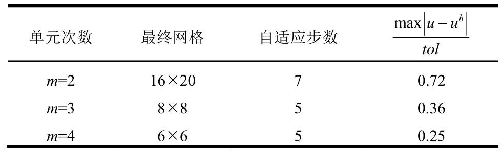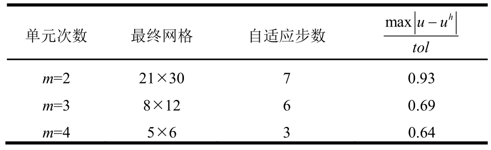 单元次数 最终网格 自适应步数maxhu-utol m=2 17×16 8 0.96m=3 7×8 6 0.98m=4 4×4 4 0.29