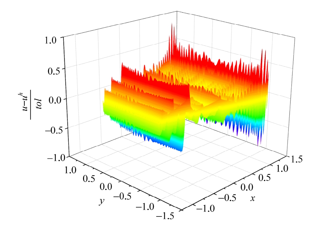 四边给定位移边界条件。计算结果如表4所示,以二次元为例,最终得到自适应有限元网格划分如图11所示,其有限元近似解如图12所示,同精确解比其全域误差比如图13所示。
