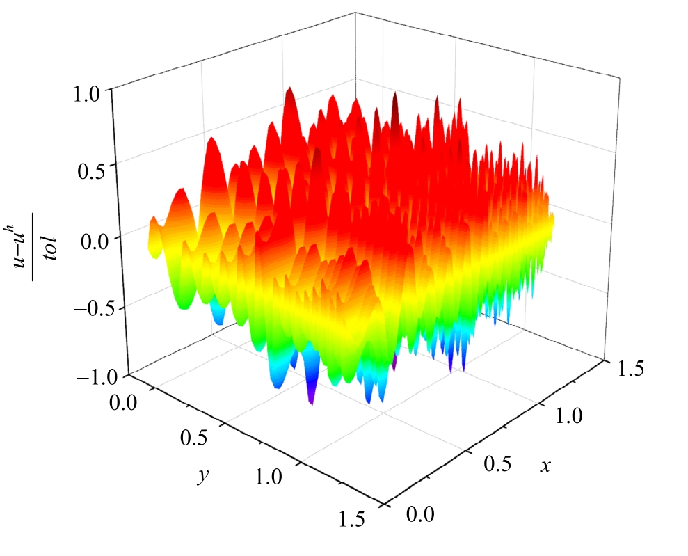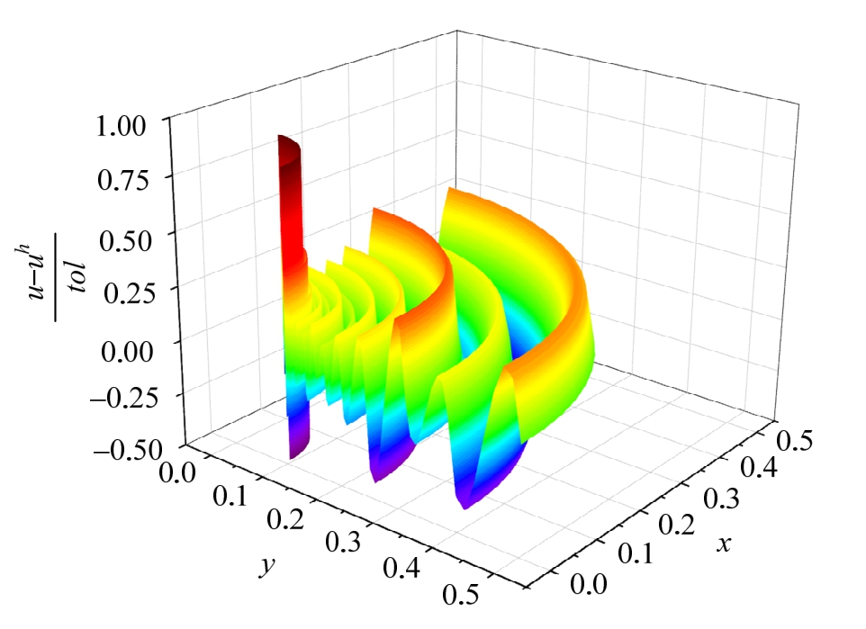 边界条件给定如图5所示。计算结果如表2所示,以二次元为例,最终得到自适应有限元网格划分如图5所示,其有限元近似解如图6所示,同精确解比其全域误差比如图7所示。