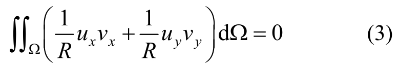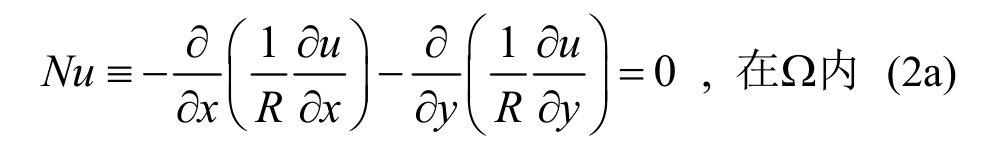 其中下标x,y表示对其求偏导。求膜面面积最小值,对式(1)取一阶变分,由其驻值条件可导出相应的Euler方程: