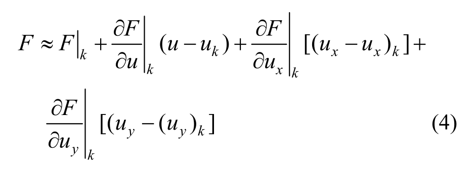 式(2)为一非线性偏微分方程,难以直接对其求解,通常解法是将其线性化,并进行迭代求解。非线性迭代方法众多,二维非线性问题也存在着多种线性化路径。Newton法是一种广为采用的非线性迭代方法,具有局部二阶收敛特性。本文采用基于弱形式的Newton法将原非线性模型问题线性化,与此同时,建立起相应的Newton迭代格式;思路自然直接、简明清晰,推导过程如下。