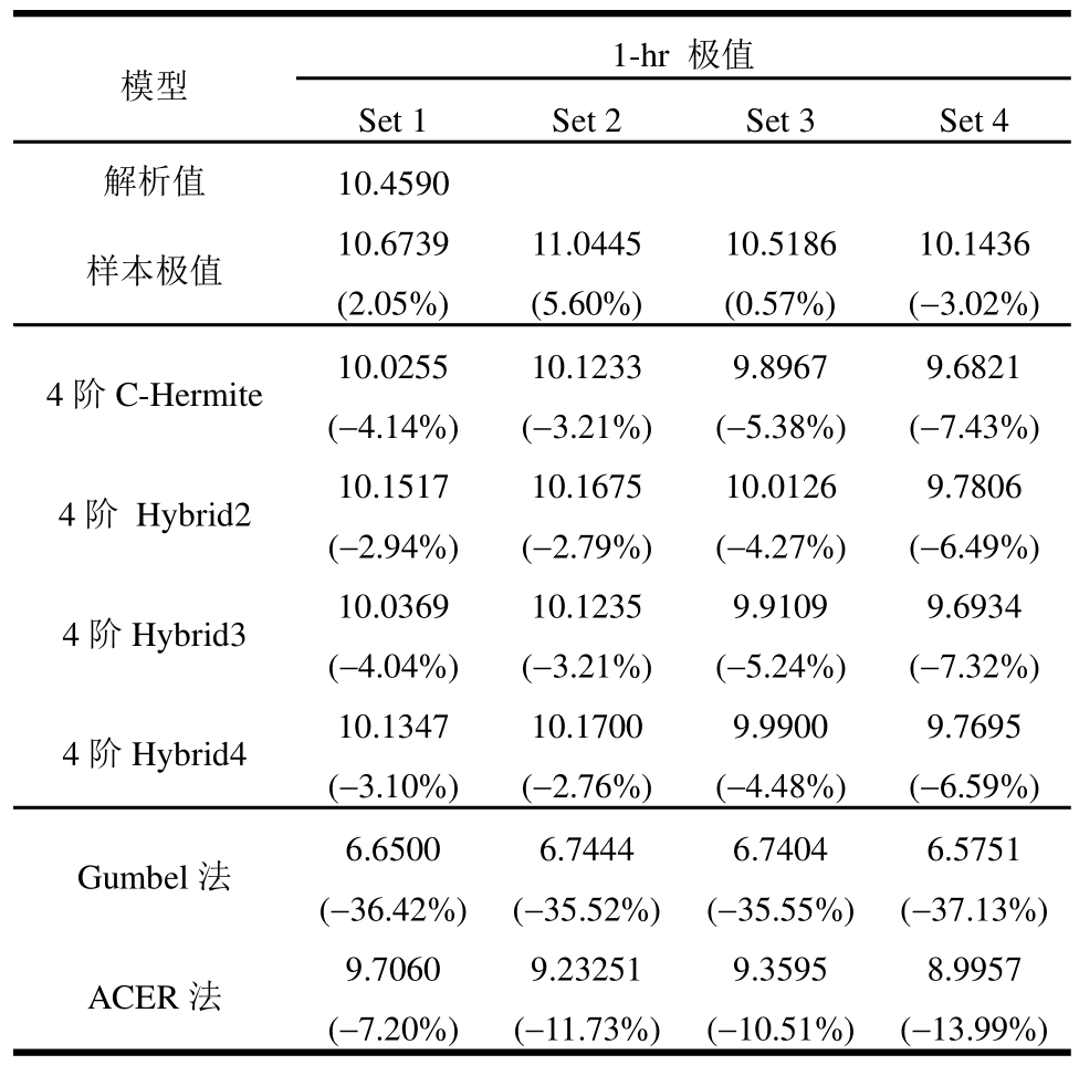 模型 1-hr 极值Set 1 Set 2 Set 3 Set 4解析值 10.4590样本极值 10.6739 11.0445 10.5186 10.1436(2.05%) (5.60%) (0.57%) (-3.02%)4阶C-Hermite 10.0255 10.1233 9.8967 9.6821(-4.14%) (-3.21%) (-5.38%) (-7.43%)4阶 Hybrid2 10.1517 10.1675 10.0126 9.7806(-2.94%) (-2.79%) (-4.27%) (-6.49%)4阶Hybrid3 10.0369 10.1235 9.9109 9.6934(-4.04%) (-3.21%) (-5.24%) (-7.32%)4阶Hybrid4 10.1347 10.1700 9.9900 9.7695(-3.10%) (-2.76%) (-4.48%) (-6.59%)Gumbel法 6.6500 6.7444 6.7404 6.5751(-36.42%) (-35.52%) (-35.55%) (-37.13%)ACER法 9.7060 9.23251 9.3595 8.9957(-7.20%) (-11.73%) (-10.51%) (-13.99%)