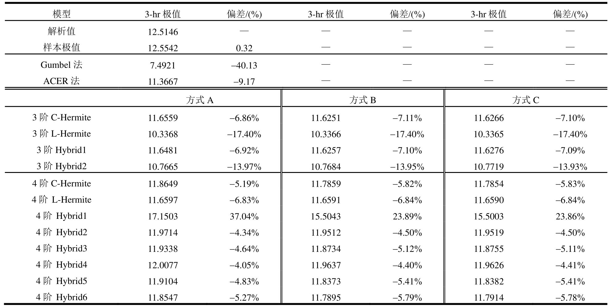 模型 3-hr极值 偏差/(%) 3-hr极值 偏差/(%) 3-hr极值 偏差/(%)解析值 12.5146 — — — — —样本极值 12.5542 0.32 — — — —Gumbel法 7.4921 -40.13 — — — —ACER法 11.3667 -9.17 — — — —方式A 方式B 方式C 3阶C-Hermite 11.6559 -6.86% 11.6251 -7.11% 11.6266 -7.10%3阶L-Hermite 10.3368 -17.40% 10.3366 -17.40% 10.3365 -17.40%3阶Hybrid1 11.6481 -6.92% 11.6257 -7.10% 11.6276 -7.09%3阶Hybrid2 10.7665 -13.97% 10.7684 -13.95% 10.7719 -13.93%4阶C-Hermite 11.8649 -5.19% 11.7859 -5.82% 11.7854 -5.83%4阶 L-Hermite 11.6597 -6.83% 11.6591 -6.84% 11.6590 -6.84%4阶 Hybrid1 17.1503 37.04% 15.5043 23.89% 15.5003 23.86%4阶 Hybrid2 11.9714 -4.34% 11.9512 -4.50% 11.9519 -4.50%4阶 Hybrid3 11.9338 -4.64% 11.8734 -5.12% 11.8755 -5.11%4阶 Hybrid4 12.0077 -4.05% 11.9637 -4.40% 11.9626 -4.41%4阶 Hybrid5 11.9104 -4.83% 11.8373 -5.41% 11.8382 -5.41%4阶 Hybrid6 11.8547 -5.27% 11.7895 -5.79% 11.7914 -5.78%