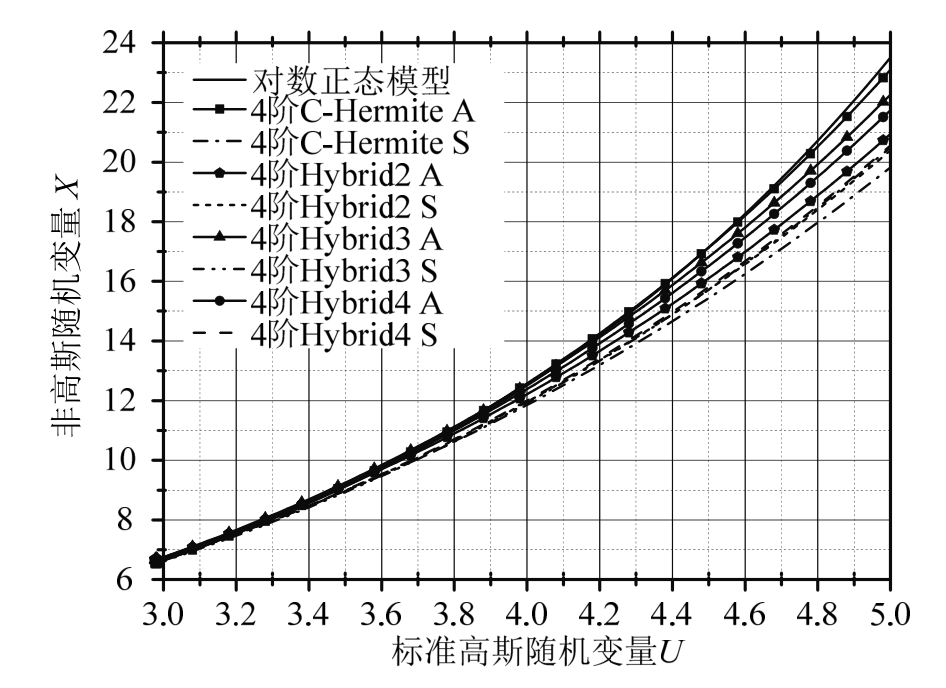 图 3给出了 4阶的 C-Hermite和 Hybrid2~Hybrid4模型中非高斯随机变量X关于标准高斯随机变量U的变化曲线(方式A),其中4阶C-Hermite模型在解析情况下着实给出了最为精确的近似,与对数正态模型几乎重合。但是,当其使用样本中心矩时,其精度受到高阶样本矩的不确定性影响,反而使其产生了较大的偏移。4阶的Hybrid2、Hybrid3、Hybrid4的曲线非常接近,在样本有限的情况下,表现出较好的准确性。但是注意到,Hybrid3 A到Hybrid3 S的偏移量是比较大的,这是因为其使用了第5阶中心矩的原因,但在表4中可以看到,第5阶中心矩由于样本长度不够发生了高达-18.82%的误差。相对的,Hybrid2和Hybrid4由于使用了第5阶线性矩替代第5阶中心矩,它们的偏移非常小。