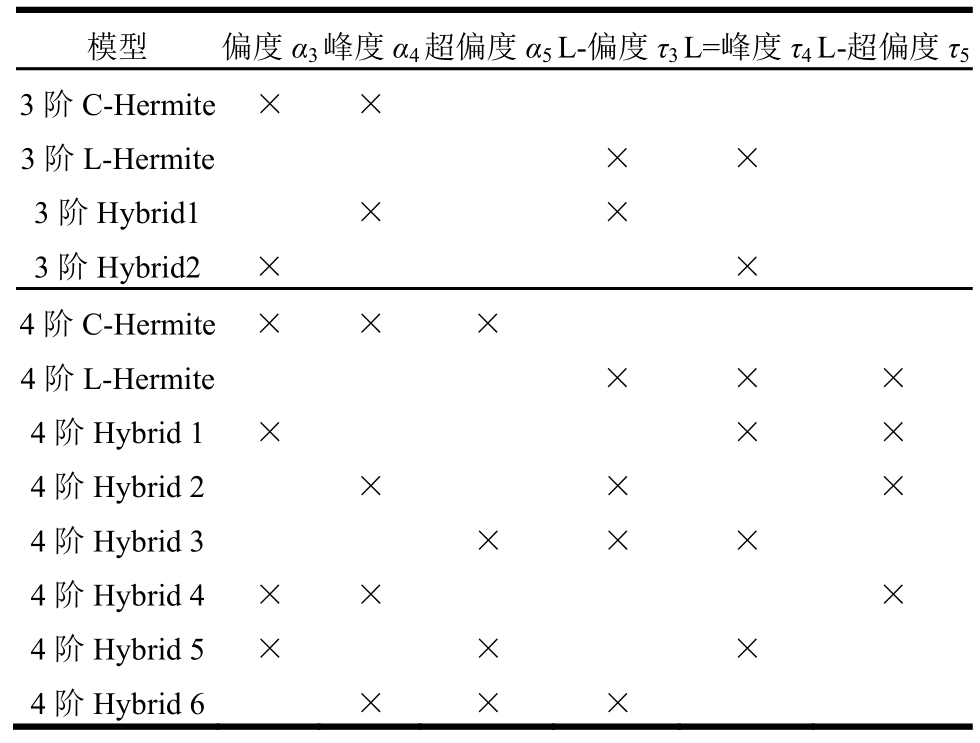 模型 偏度α3峰度α4超偏度α5L-偏度τ3L=峰度τ4L-超偏度τ53阶C-Hermite × ×3阶L-Hermite × ×3阶Hybrid1 × ×3阶Hybrid2 × ×4阶C-Hermite × × ×4阶L-Hermite × × ×4阶Hybrid 1 × × ×4阶Hybrid 2 × × ×4阶Hybrid 3 × × ×4阶Hybrid 4 × × ×4阶Hybrid 5 × × ×4阶Hybrid 6 × × ×