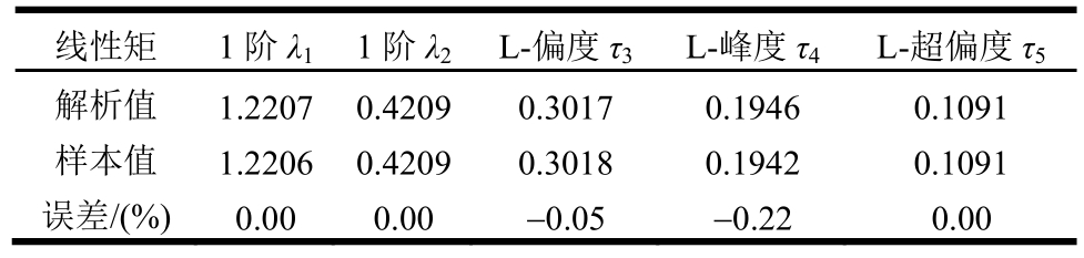 线性矩 1 阶λ11 阶λ2L-偏度τ3L-峰度τ4L-超偏度τ5解析值 1.2207 0.4209 0.3017 0.1946 0.1091样本值 1.2206 0.4209 0.3018 0.1942 0.1091误差/(%) 0.00 0.00 -0.05 -0.22 0.00