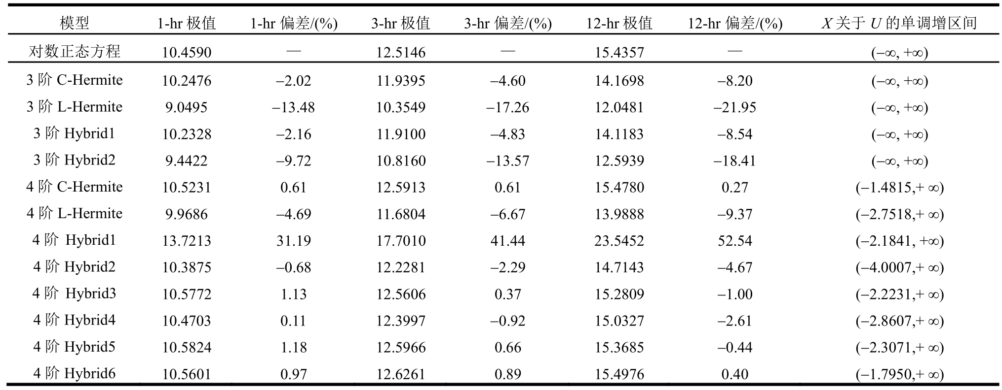 模型 1-hr极值 1-hr偏差/(%) 3-hr极值 3-hr偏差/(%) 12-hr极值 12-hr偏差/(%)X关于U的单调增区间对数正态方程 10.4590 — 12.5146 — 15.4357 — (-∞,+∞)3阶C-Hermite 10.2476 -2.02 11.9395 -4.60 14.1698 -8.20 (-∞,+∞)3阶L-Hermite 9.0495 -13.48 10.3549 -17.26 12.0481 -21.95 (-∞,+∞)3阶Hybrid1 10.2328 -2.16 11.9100 -4.83 14.1183 -8.54 (-∞,+∞)3阶Hybrid2 9.4422 -9.72 10.8160 -13.57 12.5939 -18.41 (-∞,+∞)4 阶C-Hermite 10.5231 0.61 12.5913 0.61 15.4780 0.27 (-1.4815,+∞)4 阶L-Hermite 9.9686 -4.69 11.6804 -6.67 13.9888 -9.37 (-2.7518,+∞)4阶 Hybrid1 13.7213 31.19 17.7010 41.44 23.5452 52.54 (-2.1841,+∞)4 阶 Hybrid2 10.3875 -0.68 12.2281 -2.29 14.7143 -4.67 (-4.0007,+∞)4 阶 Hybrid3 10.5772 1.13 12.5606 0.37 15.2809 -1.00 (-2.2231,+∞)4阶 Hybrid4 10.4703 0.11 12.3997 -0.92 15.0327 -2.61 (-2.8607,+∞)4 阶 Hybrid5 10.5824 1.18 12.5966 0.66 15.3685 -0.44 (-2.3071,+∞)4阶 Hybrid6 10.5601 0.97 12.6261 0.89 15.4976 0.40 (-1.7950,+∞)