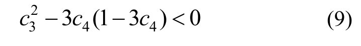 在使用Hermite模型进行极值预报时,需要确保关注的极值处于模型的单调递增区间内(即:dX/dU>0),这样才能保证在U达到最大值时,X同样达到最大值。因此,明确4阶Hermite模型的单调区间至关重要。对式(10)求偏导,得到: