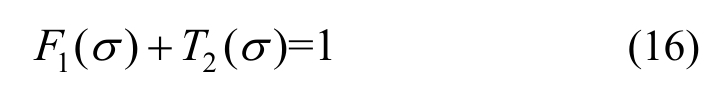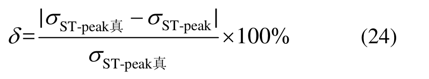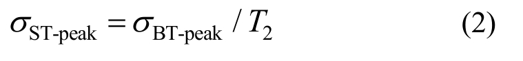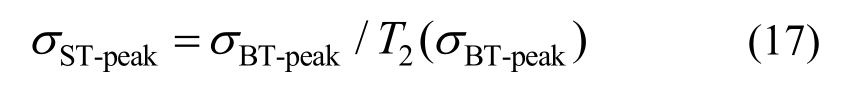 由于在界面1上,σBI和σBR是已知的,通过实验结果,可以很容易地得到不同应力σSI对应的F1之值,将二者数据拟合,便可得到拟合的F1(σ)函数式。再结合式(16),可得到拟合的T2(σ)函数式,即界面2上试样端部应力σBT与T2的关系,既而联立式(2),便可计算得到σST-peak的真实值,表示为:
