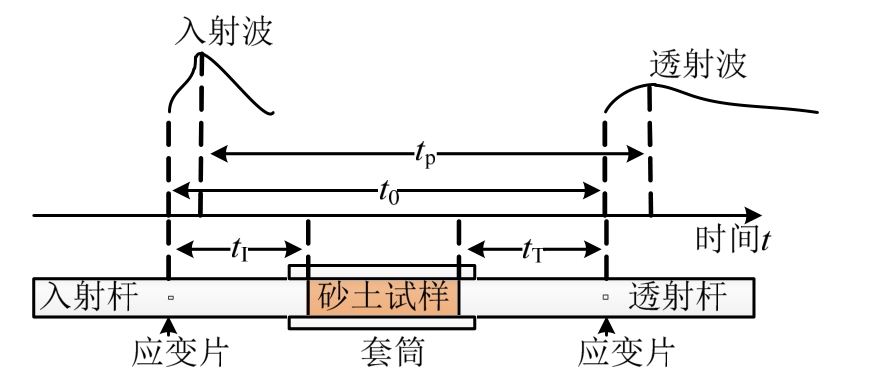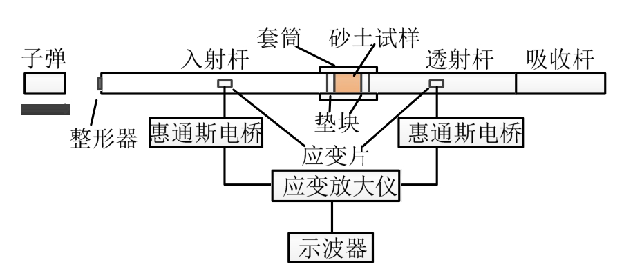 由Hopkinson[8]提出,并经Kolsky[9]改进后,分离式霍普金森压杆(split hopkinson pressure bar,SHPB)[10]已广泛地应用于测量各种材料(金属[11-12]、混凝土[13-14]、岩石[15]、陶瓷[16]、泡沫与孔隙材料[17]、复合材料[18]、生物材料[19]等)在高应变率下的力学性质,其最大的优点在于,能够通过测量两弹性长杆中的应力波,通过时域平移,间接而准确地反映试件两端面的应力状态。正是基于这一特点,Ross等[20]采用SHPB研究了受侧限的不同长度的砂土试样中应力波的传播规律,然而,不同于传统 SHPB材料实验,为探究应力波在试件中单程的传播规律,在所试时间内,不允许应力波在试件内部的多次反射,试件两端不存在应力平衡。并且,砂土试样的波阻抗并非恒值,无法直接通过透射杆中的透射波精确且直接的计算得到试件尾部的应力状态,故Ross等[20]仅通过比较了两杆中入射波与透射波,讨论试件中应力波的衰减,赵凯[21]也采用同样的方式研究了分层防护层对爆炸波的衰减作用。然而,杆中的入射波与透射波并不能准确代表试件两端的应力状态,这一方法只能在一定程度上得到定性的结论。