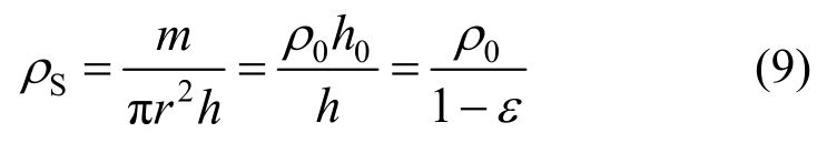 式中:杆件的密度Bρ和弹性模量EB,由于杆件始终为弹性变形,二者是恒值。但是,试样的密度Sρ与侧限切线模量MS(即一维应变状态的切线模量)则非恒定值。这是因为,试样受力过程中发生的并非弹性变形,其侧限切线模量MS也会受到影响而变化,并且,砂土材料具有多孔特性,受力过程中具有大变形的特点,变形对于密度Sρ的影响必须考虑。