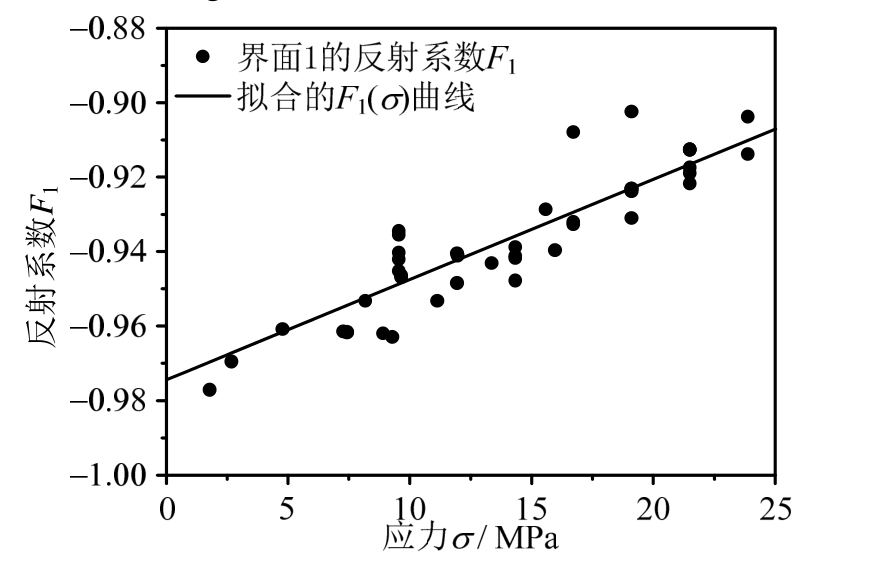 图8 为75 mm实验的典型波形,可以看出,由于试件的波阻抗与杆件相差较大,大部分的入射波反射回了入射杆。为尽量减小误差,本文只选用入射波与反射波的峰值对F1()σ进行拟合,结果如图9所示。图中散点为实验结果,实线是线性拟合的曲线,其表达式为: