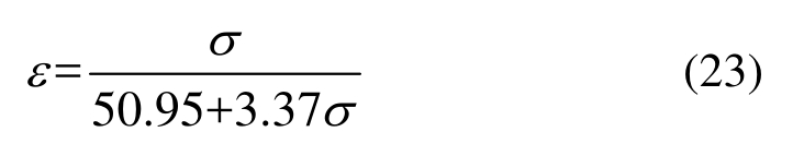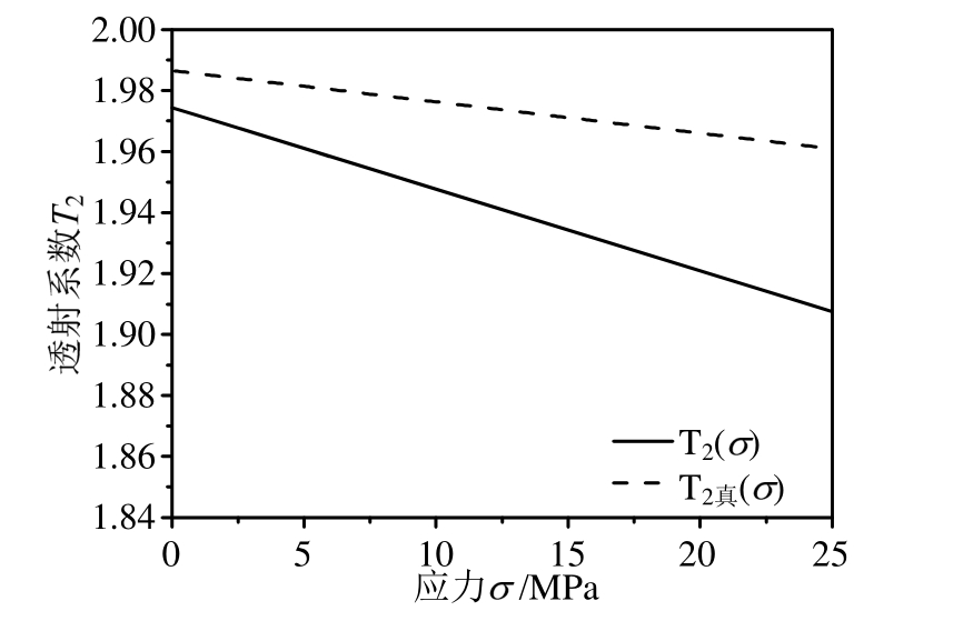即a=50.95 MPa,b=3.37。式(23)拟合曲线的调整决定系数R2为0.9916。将参数代入式(23),并结合式(13)、式(16)绘制应力σ与透射系数T2真(σ)的关系,如图14中虚线所示。在0~23 MPa,T2真(σ)的变化范围是1.986~1.961。