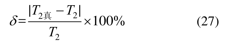 对比图 14中的两条曲线,不难发现,虽然T2(σ)与T2真(σ)的变化趋势基本一致,但由于实验误差、数据处理误差的存在,二者不可避免地存在一定误差。定义误差δ: