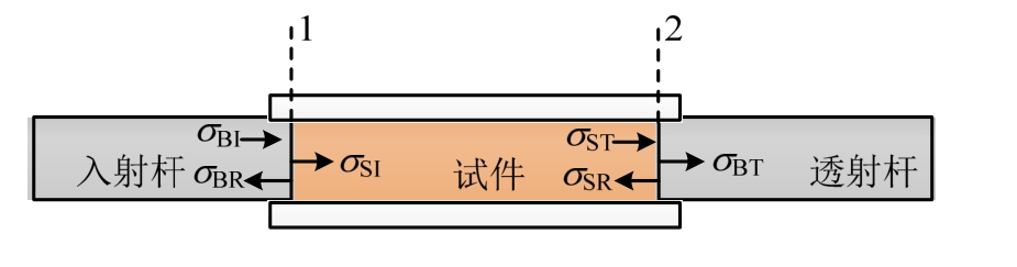 。同样,σ为试件端部轴向应力,界面2上,其值等于杆中透射波σBT,这是因为,试件端部同时受试件中的透射波σST与反射波σSR共同作用,由应力平衡可知,二者之和等于σBT。