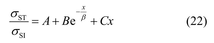 式中,A=0.023,B=0.977,β=27.08×10-3m,C=-6.24×10-2m-1。x的单位取m。式(22)拟合曲线的调整决定系数R2为0.9995。拟合曲线同样绘于图11中。