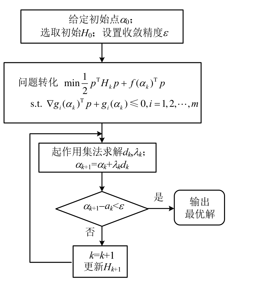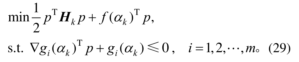 1) 利用 SQP算法将式(28)转化为求解一般约束二次规划子问题(p为搜索方向,Hk为海赛矩阵)。