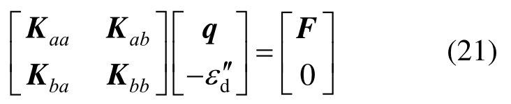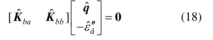 均为在整体坐标系下的整体矩阵和向量。其中,q为损伤结构的节点位移,矩阵Kbb为分块对角阵,由对角元素的Kˆbb集成得到,由于Kˆbb和损伤指数密切相关,且在优化过程中损伤指数不断变化,所以在求解过程中,仅需要更新表征损伤的刚度矩阵Kbb即可。此外,表征损伤的刚度矩阵Kbb可以从整体矩阵中隔离开来,实现模型中损伤隔离,